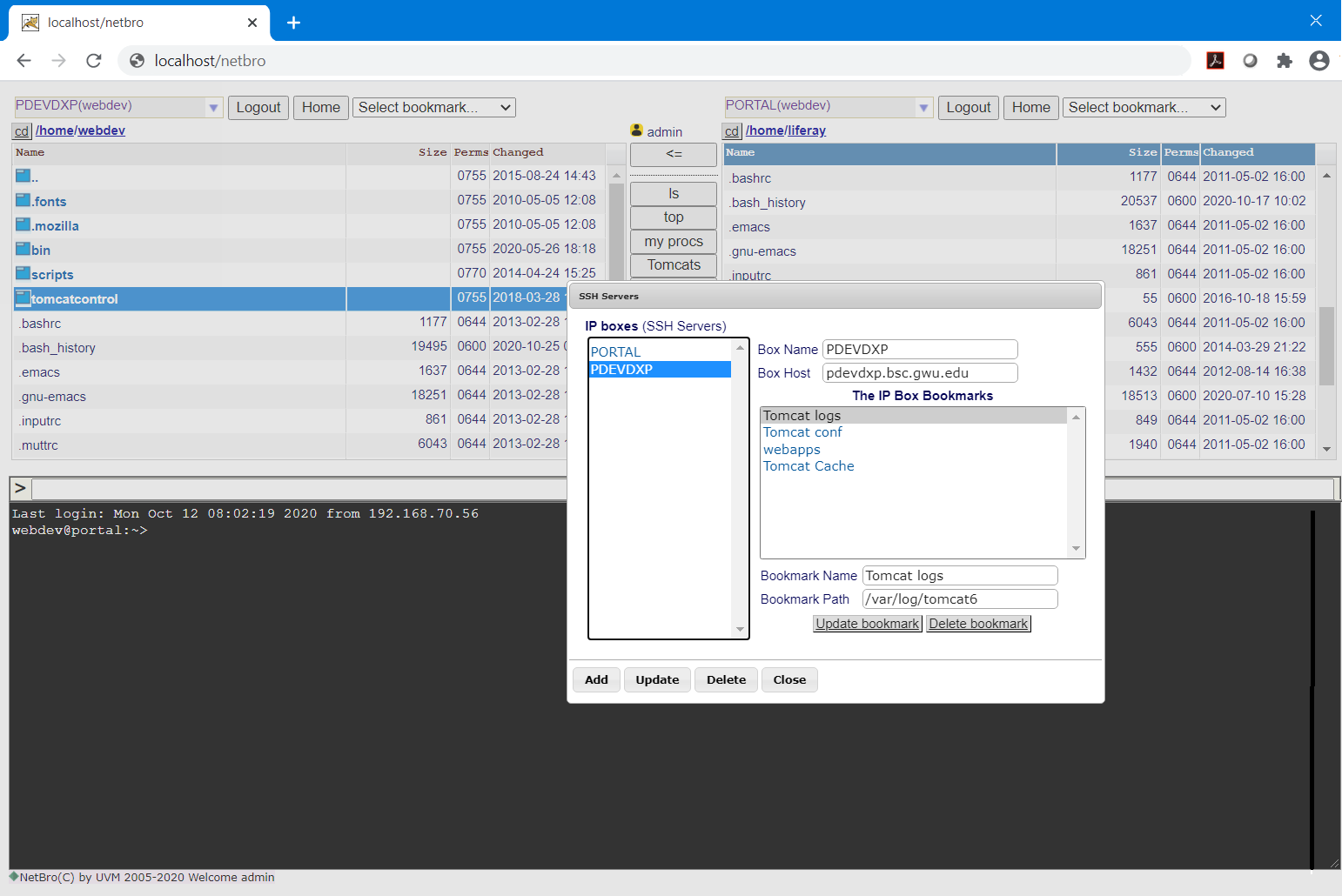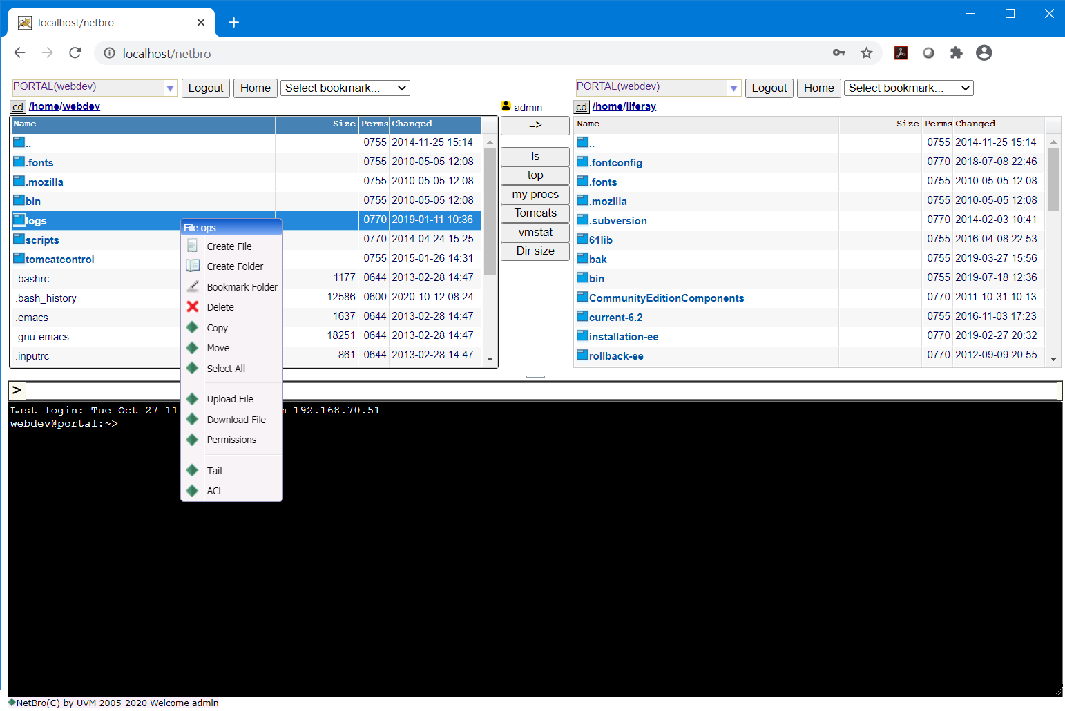 This is a typical web based dual-pane file manager (with ad-hoc remote text files editor) integrated with SSH terminal and devloped as a J2EE web application.